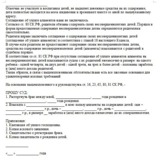 иск о расторжении брака и взыскание алиментов