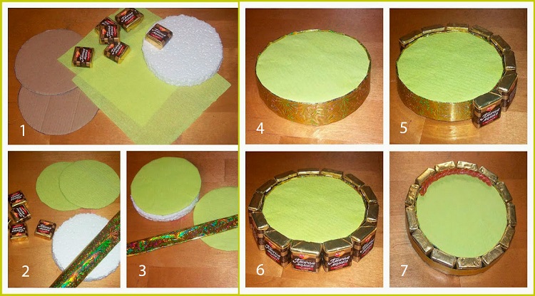 - Поверх основы с помощью пистолета/двустороннего скотча крепят конфеты.
