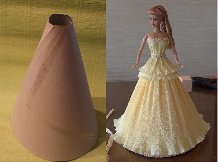 После закрепления краев, основу примеряют к кукле. Обязательно фиксируют, иначе она будет болтаться. Из гофрированной бумаги моделируется лиф, юбка.