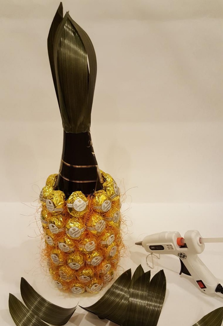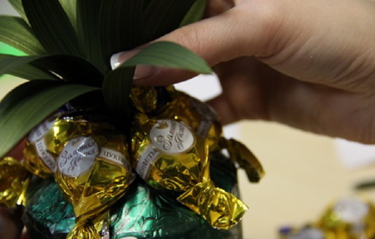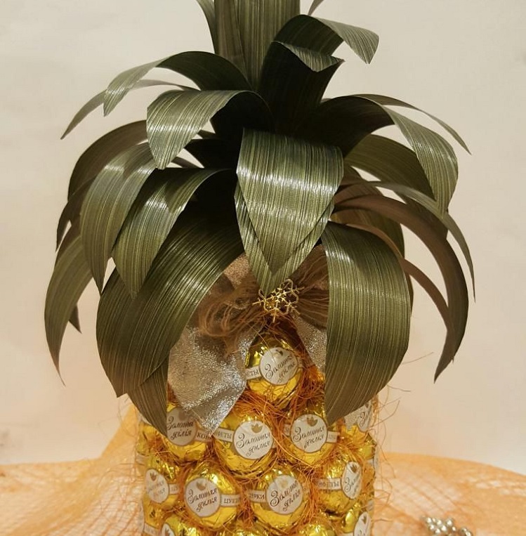 В завершении нужно обязательно спрятать хвостики обертки конфет, максимально приближая внешний вид поделки к настоящему ананасу.