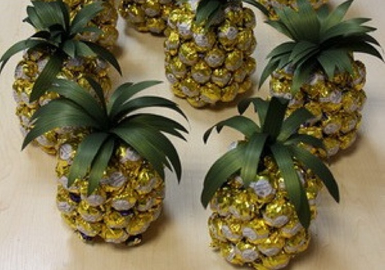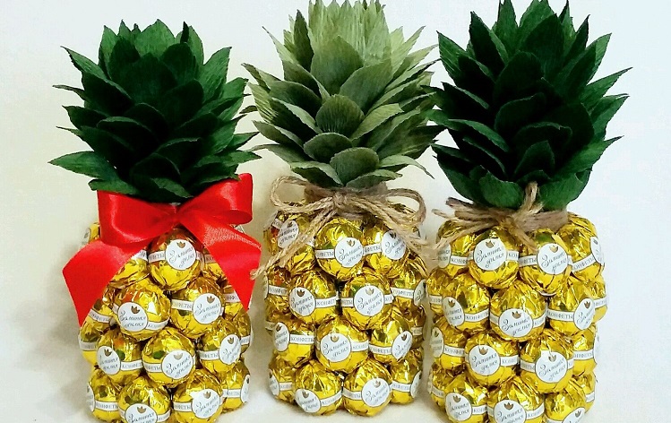 Подарочный ананас из вкусных конфет чаще всего заказывается на подарок. Он выглядит презентабельно, ярко. Такое чудо дарят как мужчинам, так и женщинам.Тут нет ограничений по половой принадлежности. Конфетный ананас станет прекрасным презентом к новогодним праздникам коллегам, начальству.
