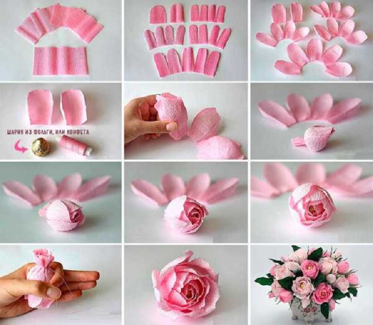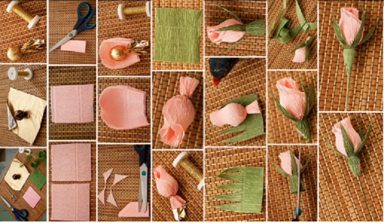 Для небольшого бутончика вам необходимо из бумаги вырезать три прямоугольные детали 4 см на 6 см — две розового цвета, одну зеленого. Три длинные, высотой около 1 см. Затем, следуя предложенной последовательности немного растянуть лепестки, сформировать бутончик вместе с конфетой.