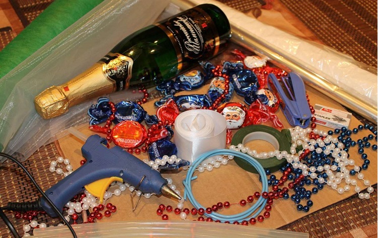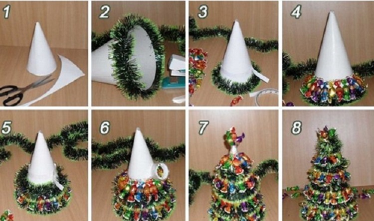 Изготовить декоративную елочку на новогодние праздники можно на бутылке. Новогоднюю мишуру клеят от донышка вверх к горлышку. После крепят сладости декор. Желательно спрятать бутылку под конусом, тогда она будет легко извлекаться из-под елочки.