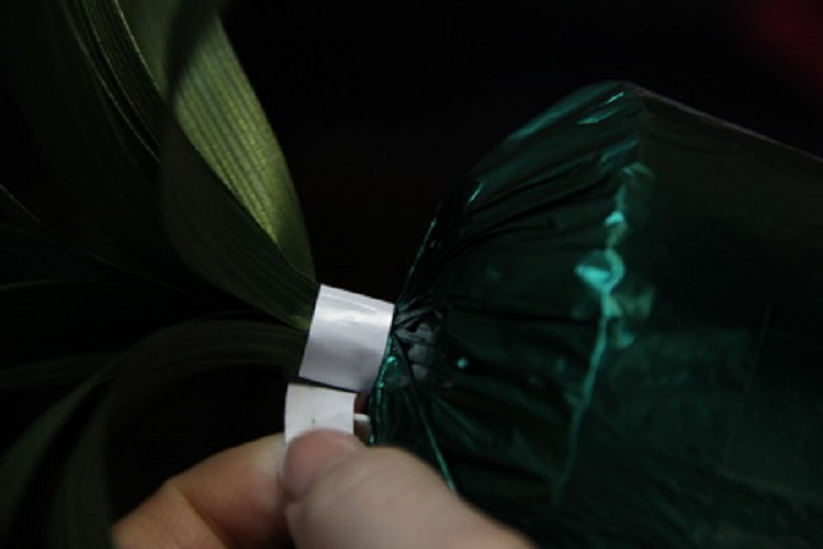 К готовому макету крепят два ряда листьев, затем фиксируют их клейкой лентой/скотчем.