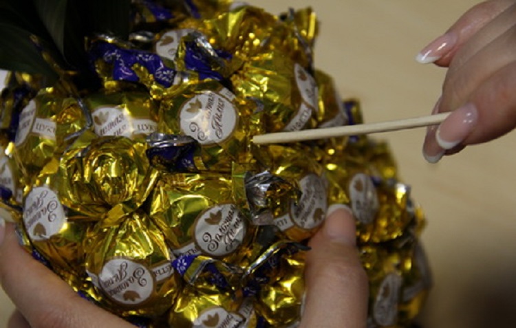Чтобы конфета плотно держалась нужна хорошая основа. Для этого используют конусный картонный или пенопластовый каркас.
