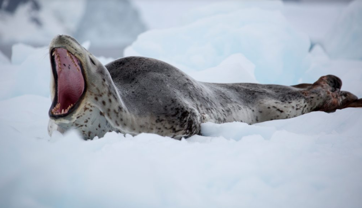 Не смотря на то, что пасть животного имеет небольшие размеры относительно туловища, морские леопарды разрывают добычу на куски.