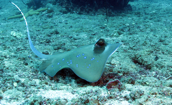 На хвосте ската расположены иглы, которые при ударе, проникают глубоко, а в образовавшуюся рану поступает яд, вызывающий сильнейшую боль, паралич а, в некоторых случаях, наступает смерть.