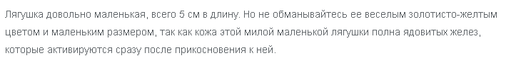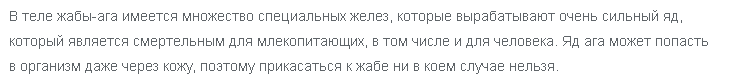 Тело жабы покрыто ядом. Концентрация яда такова, что может одним укусом убить 20 человек и двух больших слонов.