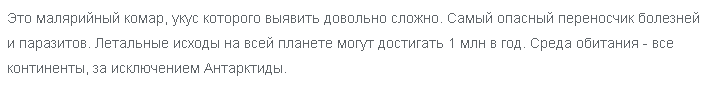 Опасность москитов заключается в том, что они способны заразить малярией несколько миллионов человек в год со смертельными исходами.