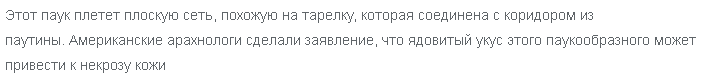 Это насекомое является самым ядовитым в своем семействе. Опасность заключается в том, что самого укуса можно не заметить, а яд паука токсичен и приводит к смертельному исходу.