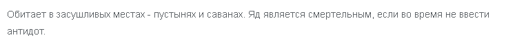 Самая опасная змея из всех существующих, обитает в Африке. Скорость передвижения — 11 км/час. Через 45 минут после укуса наступает смертельный исход.