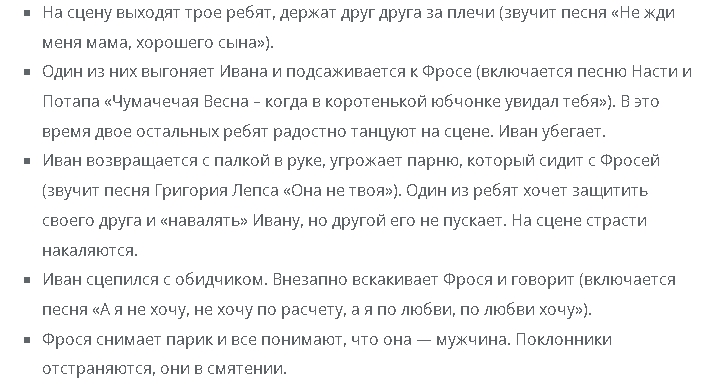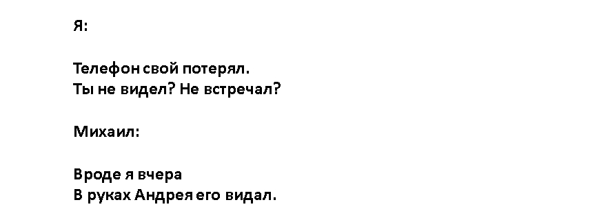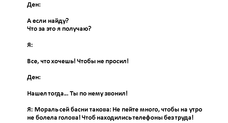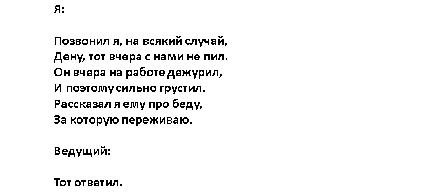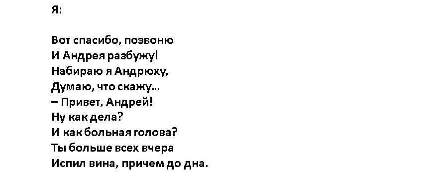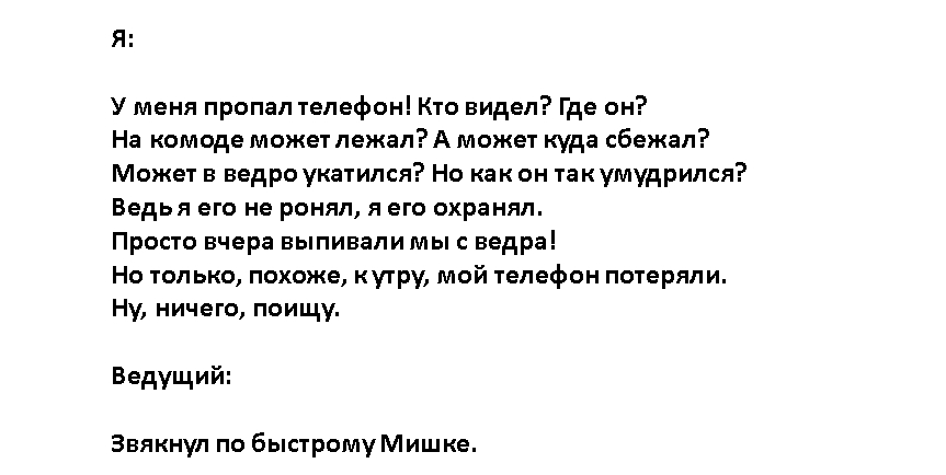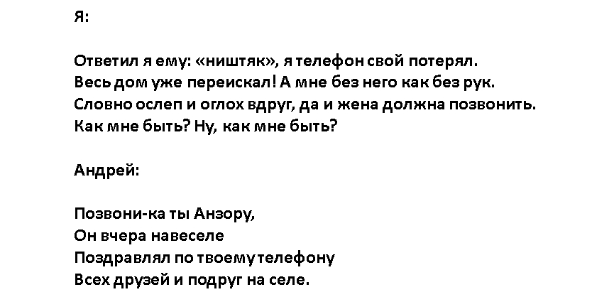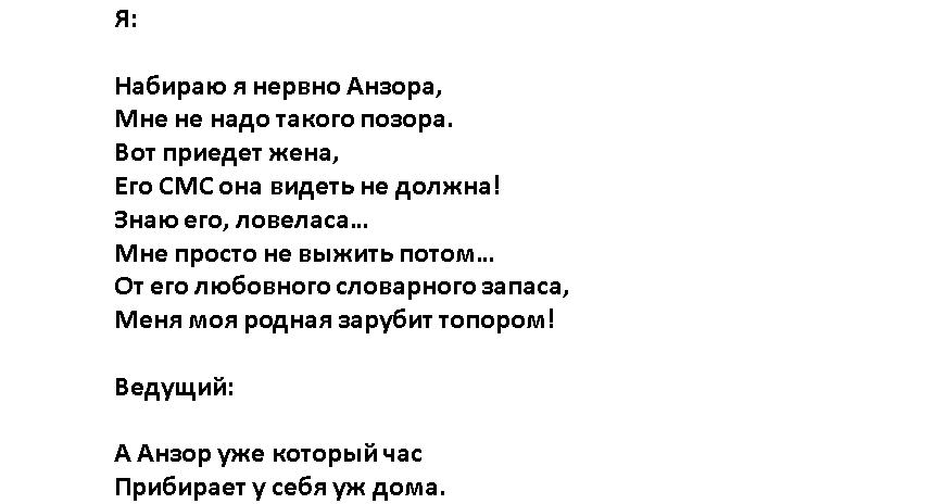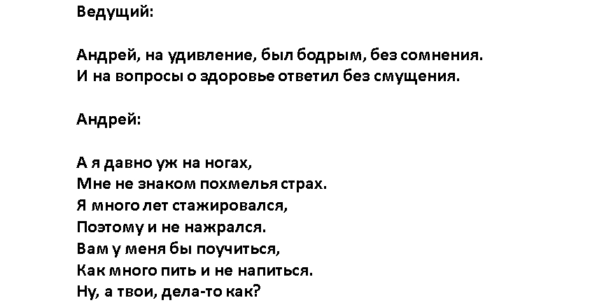 Перед показом сценки текст нужно распечатать и раздать участникам, исполняющим роли: ведущего, Андрея, Дена, Анзора, Андрея, Михаила и Я (роль от первого лица).