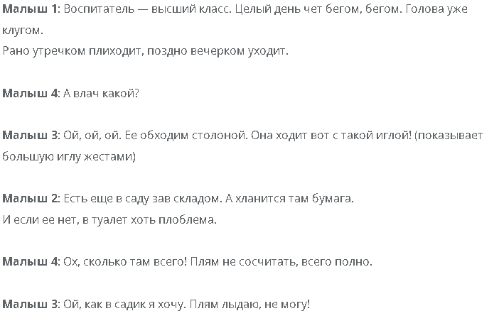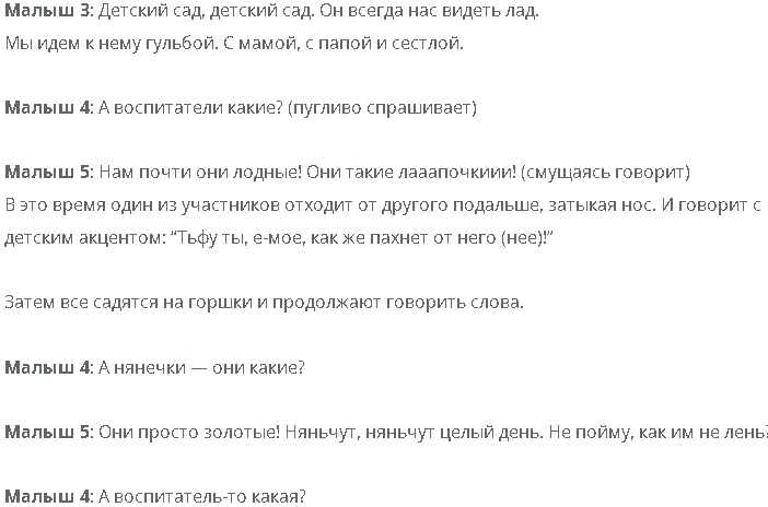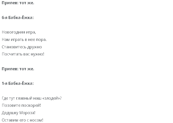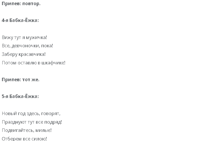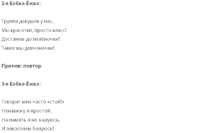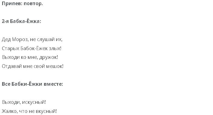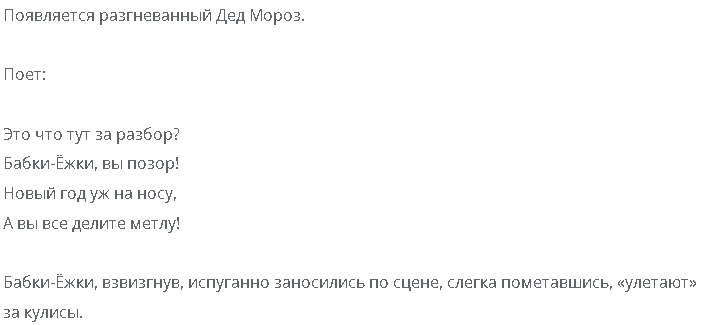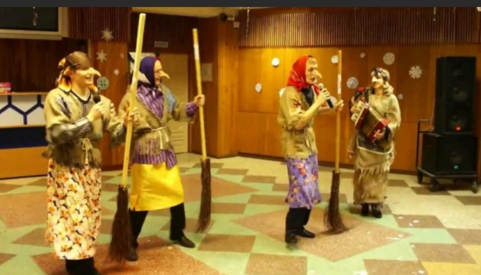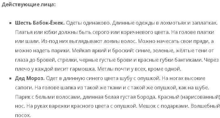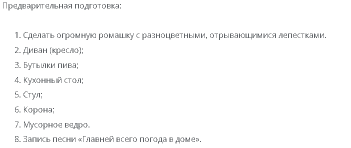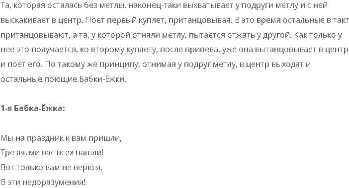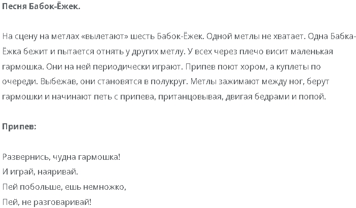 Для сценки необходимо подготовить метла — 5 штук и маленькие гармошки на ремнях, тоже 5 штук. Кроме этого, записать минусовку песни Бобок-Ежек и «артистам» выучить танец и песню.