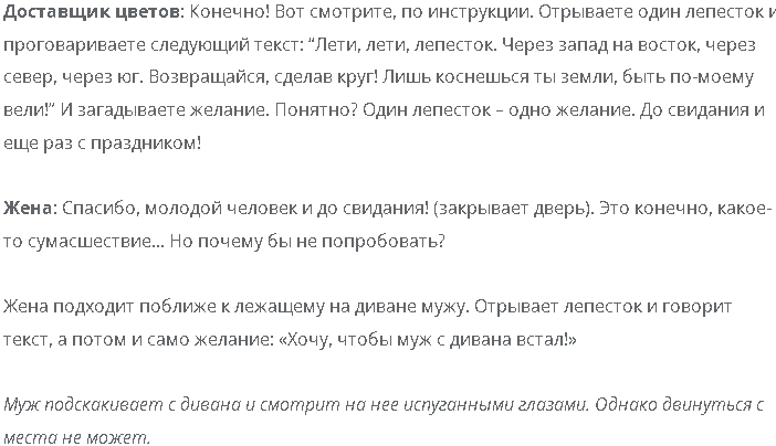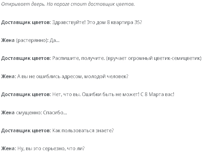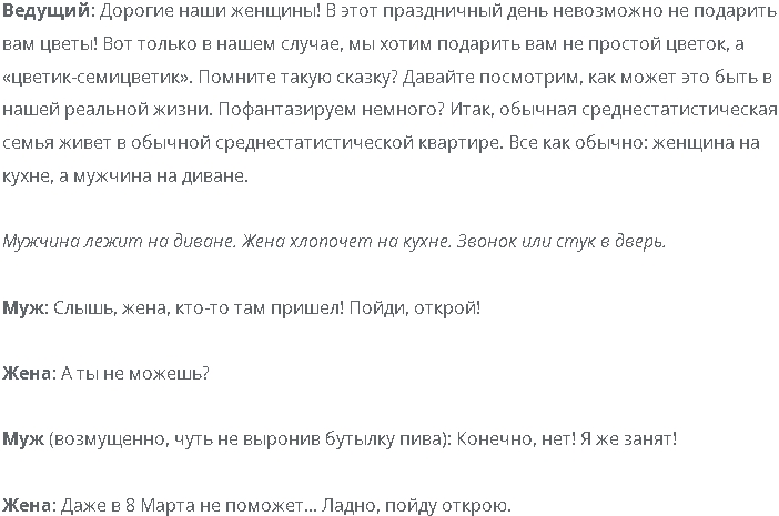 Такую занимательную сценку можно разыграть не только на корпоративе, но и дома, во время празднования Международного женского дня.