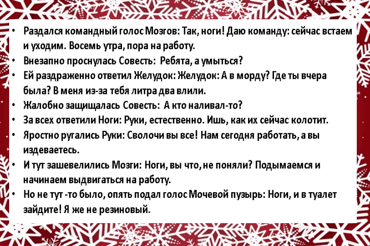 Для сценки потребуется подготовить таблички из бумаги и приклеить к ним ободки, на каждой написать название человеческого органа — желудок, мозги и т.д. Все участники сидят за одним столом, одевают на голову ободки и по очереди исполняют свою роль. Чем эмоциональнее они это делают, тем веселее и смешнее будет всем присутствующим.