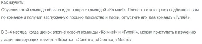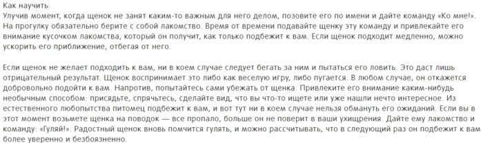 Команда: «Ко мне!».Команда: «Гуляй!».