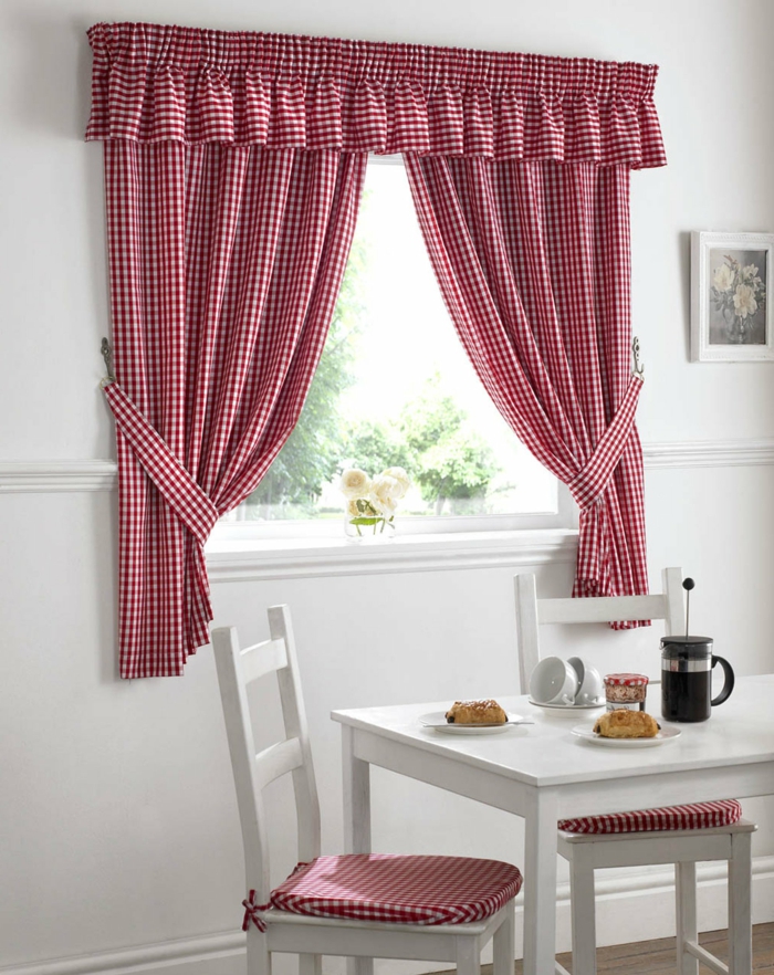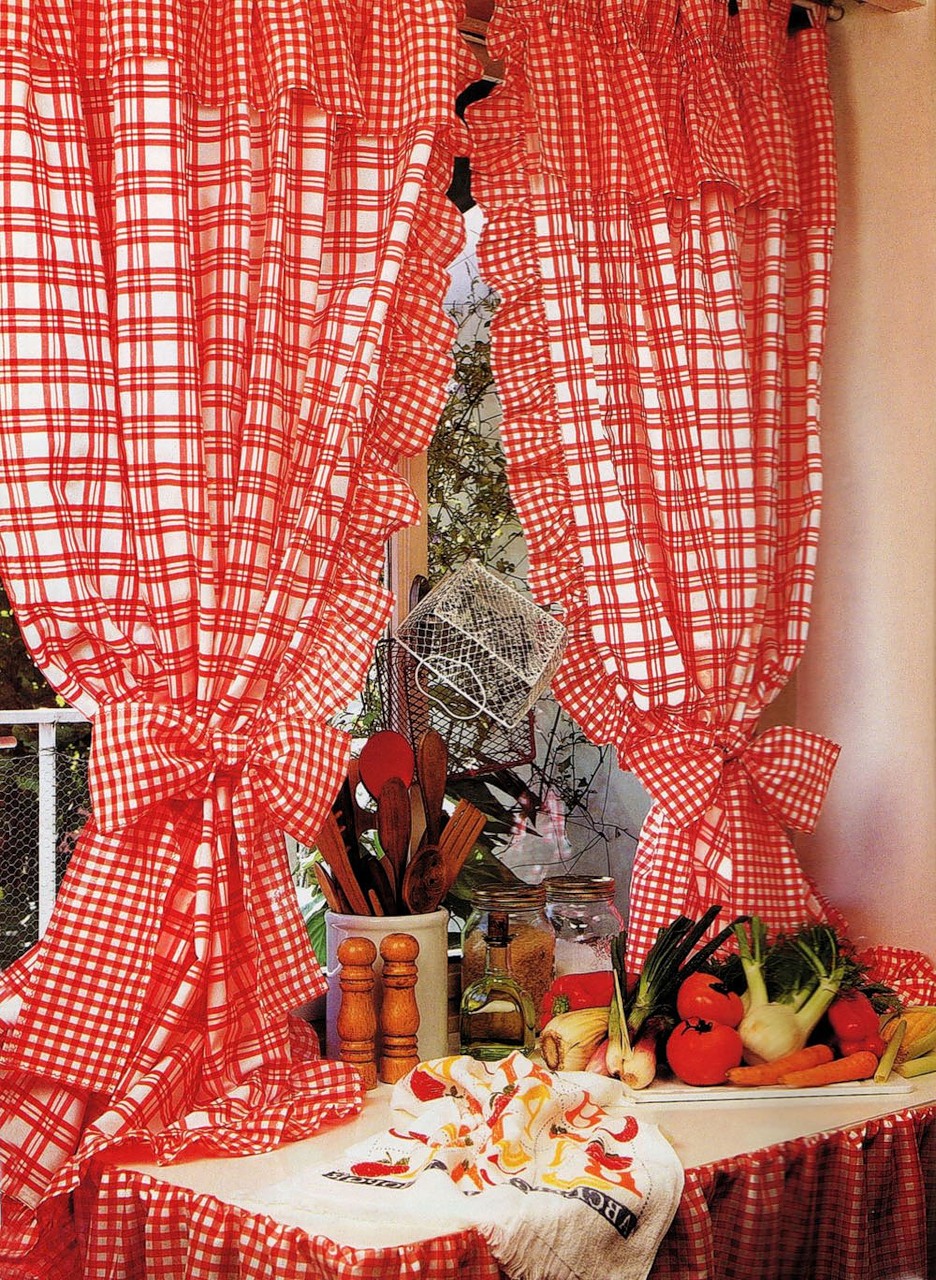 Еще один прекрасный вариант в романтическом и деревенском стиле – красные шторы в клеточку, с оборками, рюшечками и бантиками.