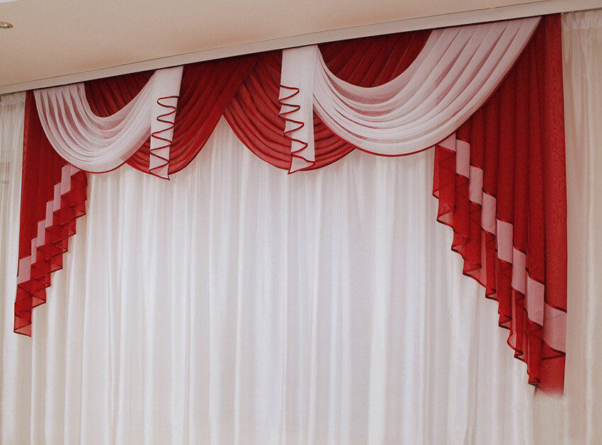 Красно-белые ламбрекены оптимально подойдут для просторных кухонь.