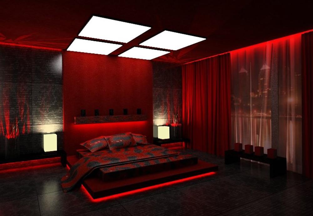 Таинственная атмосфера царит в черно-красной спальне. Многие просто в восторге от алого освящения – блики сочного цвета оригинально смотрятся на темных предметах.