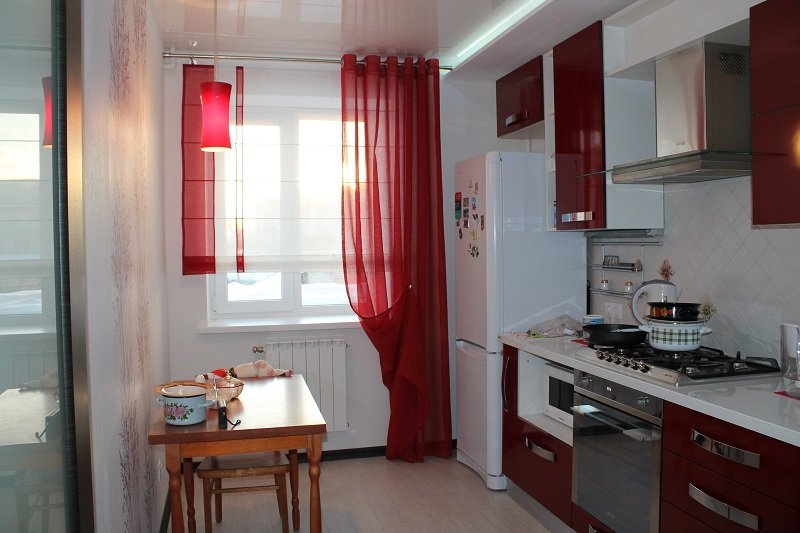 - Красные шторы в интерьере кухни