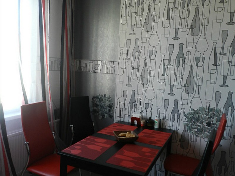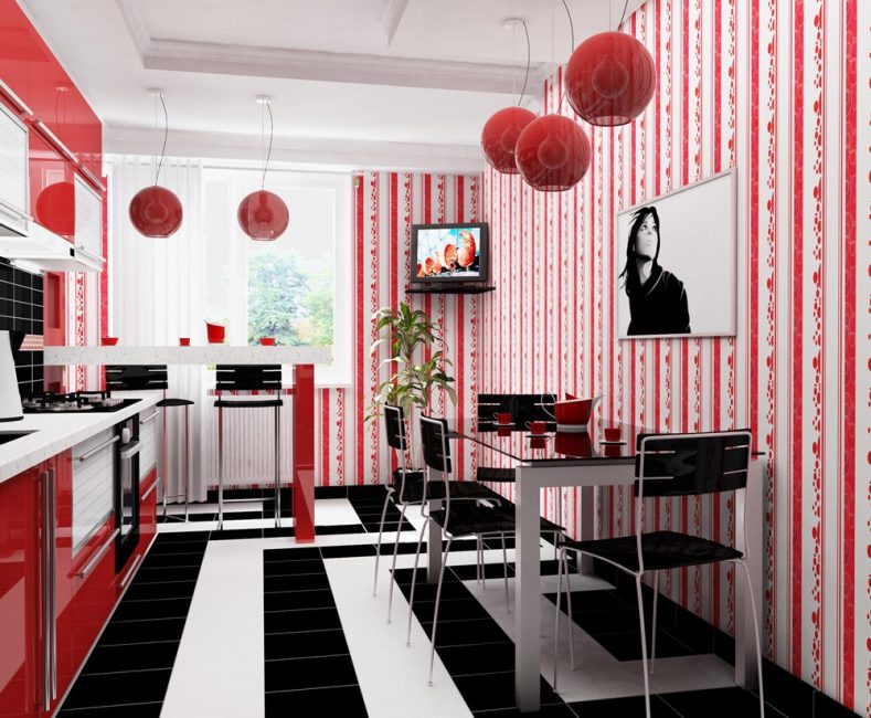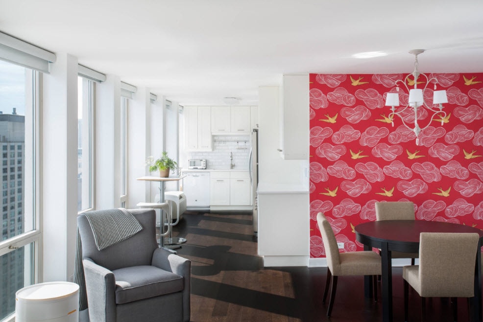 - Красные обои в интерьере кухни