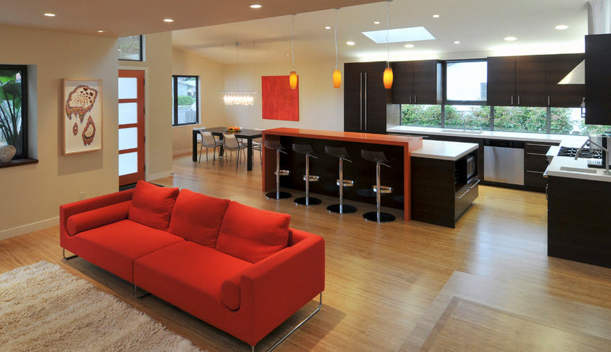 Кстати, красной может быть не только мебель – элементы напольного покрытия, занавески, люстры, декоративные мелочи часто окрашены в этот темпераментный и броский цвет. И выглядит это очень эффектно и современно.