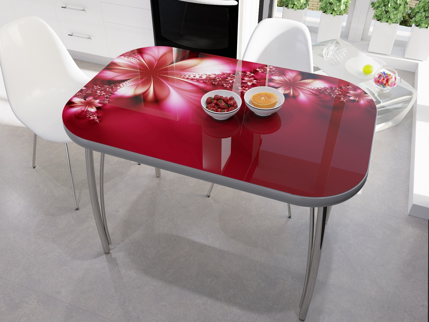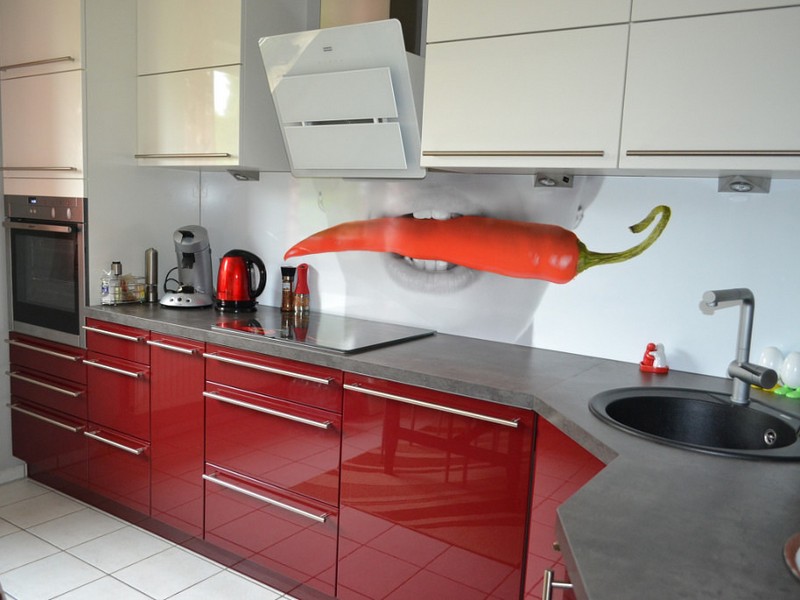 Глянцевые элементы в таком колорите напоминают многим ягоды черешни или другие спелые плоды. Подсознательно усиливая аппетит, эти цвета прекрасно подходят именно для кухни.