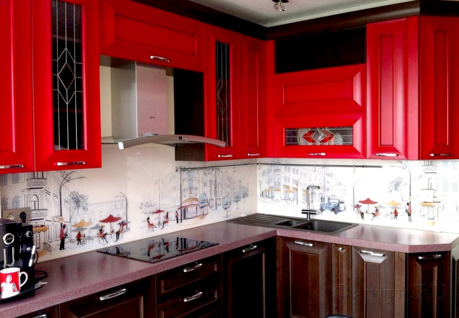Кстати, классическая кухня с окрашенными деревянными элементами и скинали в романтическом стиле (например, с парижскими улочками) тоже может быть черно-красной.