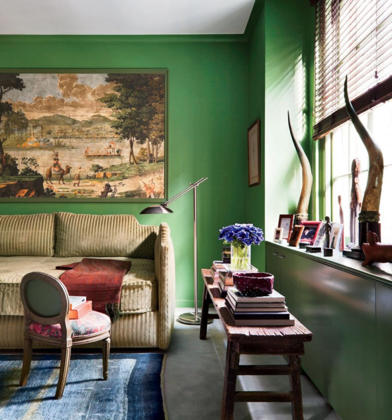 Однако идеальный, с психологической точки зрения, вариант – сделать основной акцент на светло-зеленый, оливковый и серый тона. А красный (темный или приглушенный) добавить в нескольких деталях.