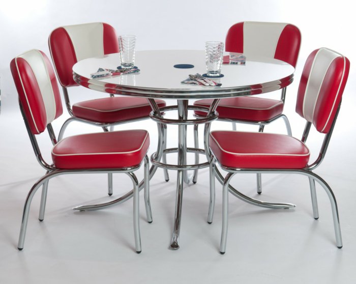 Столу и стульям на такой кухне стоит уделить особое внимание. Их лучше всего подбирать также контрастными, стилизироваными под помещение.