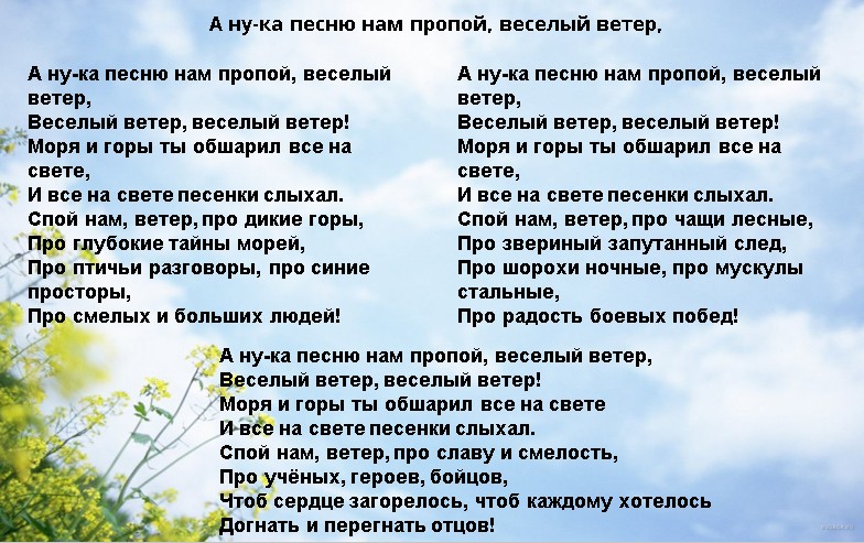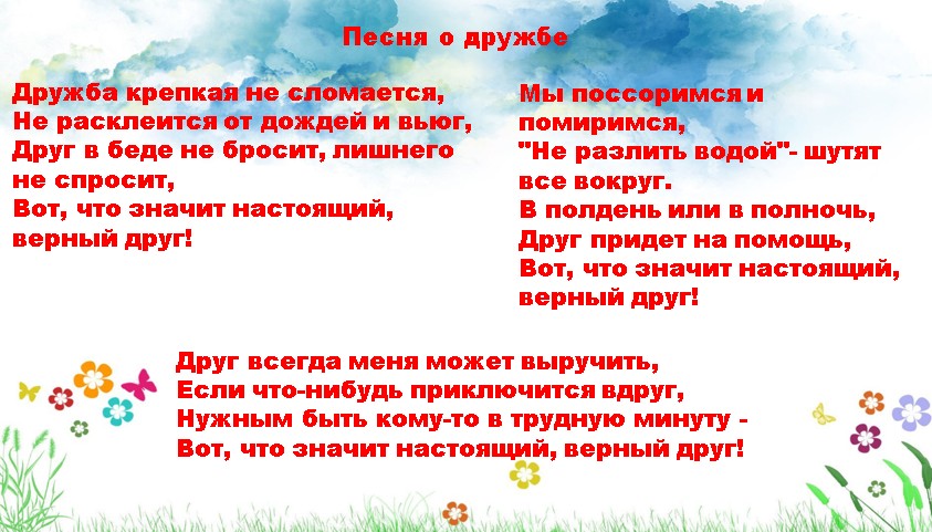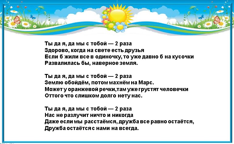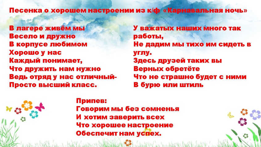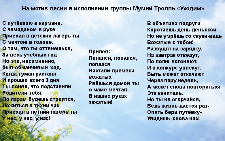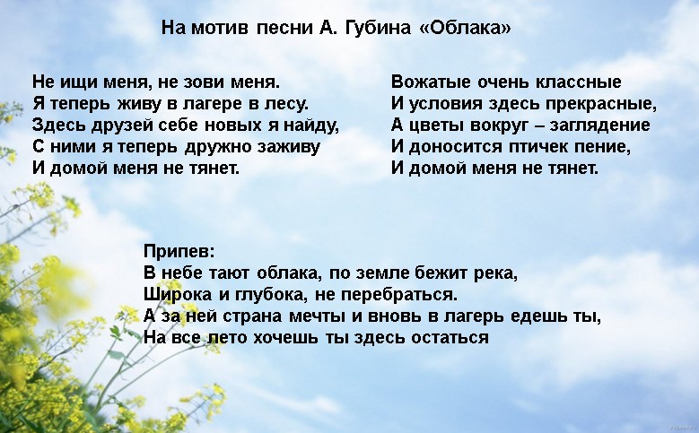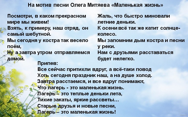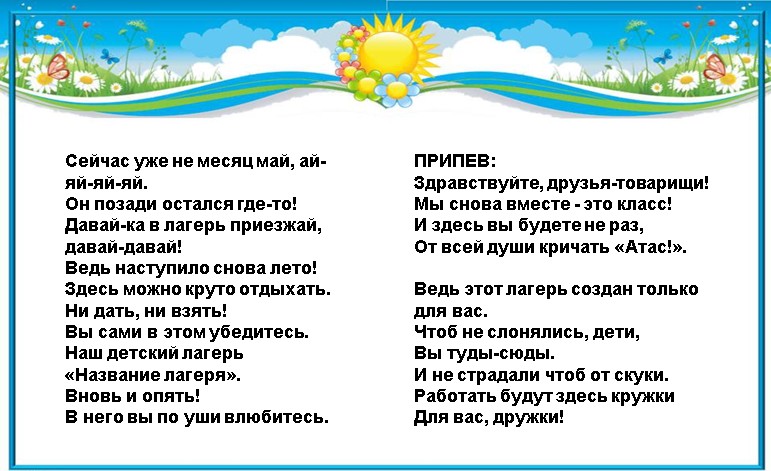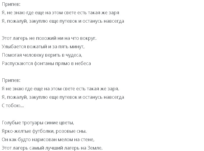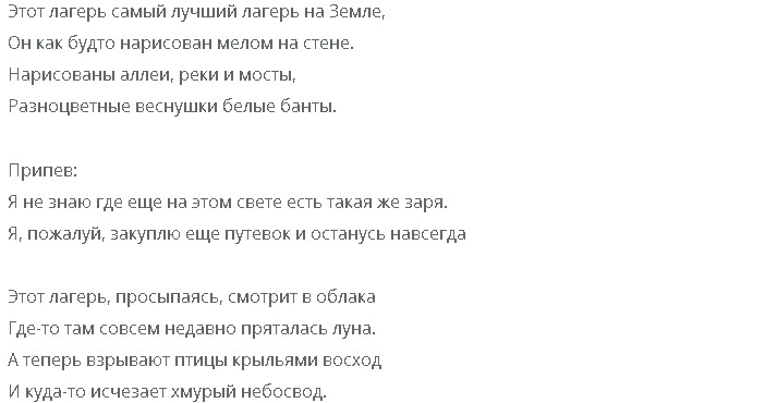 P.S.Песня сопровождает человека на протяжении всей жизни, начиная с самого детства В летних лагерях отдыха для детей она играет особую роль, создавая праздничную атмосферу, заряжая бодростью, мотивирует на добрые дела и объединяет детей и подростков. Надеемся, что наша подборка лагерных песен вам понравилась, а чтобы тексты песен были всегда под рукой, предлагаем их распечатать.