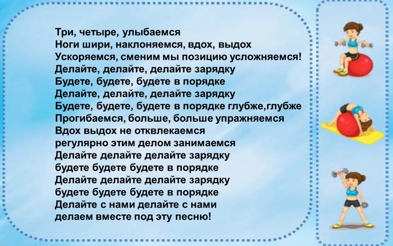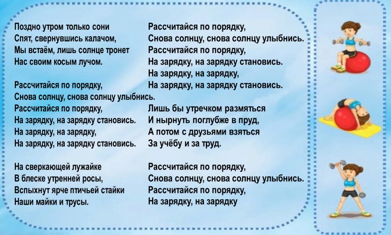 Ни один лагерь не обходится без утренней зарядки. Она помогает проснуться, зарядится энергией на весь день, а в сопровождении песен дети с удовольствием будут делать упражнения.