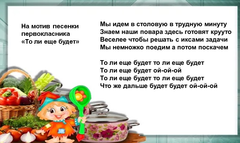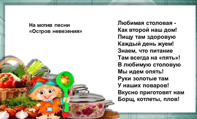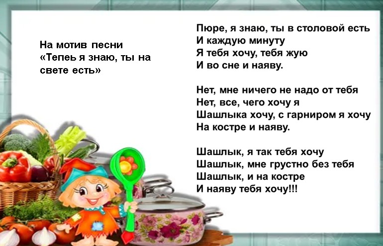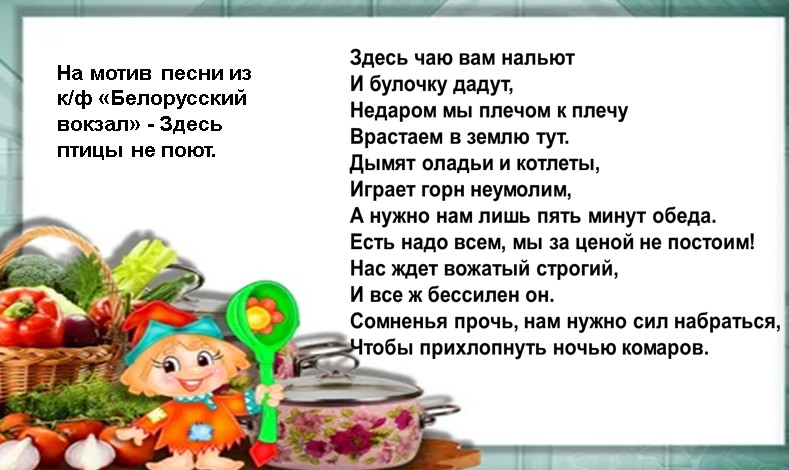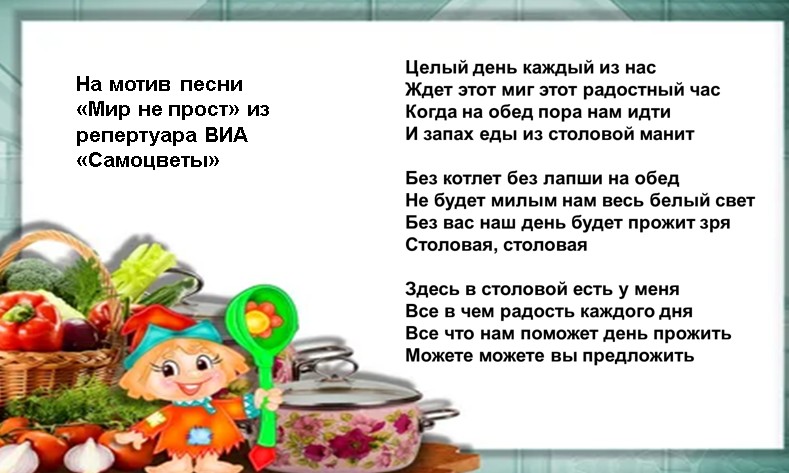 Даже такое мероприятие, как поход в столовую, тоже не обходится без песен. Построившись парами, дети с удовольствием будут петь перед вкусным обедом или ужином.