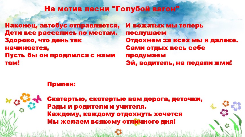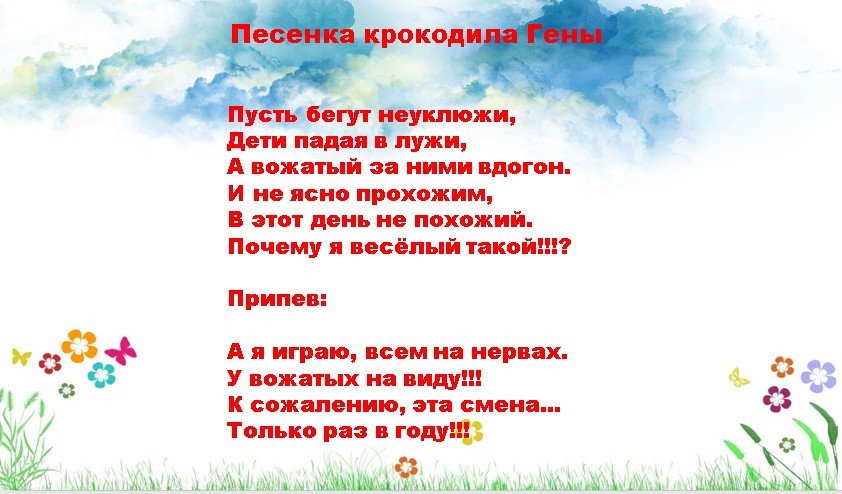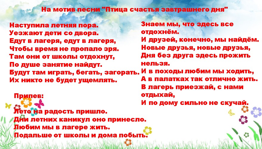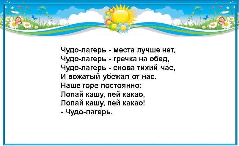 Летняя пора для ребят, это всегда праздник, заканчивается учеба в школе и родители отправляют своих детей в лагеря, где они не только набираются сил, но и весело проводят время. Песни являются неизменным атрибутом каждого лагерного отряда, они поднимают настроение заряжают позитивом и сплачивают детские коллективы. Их можно петь у костра, на прогулке, идя в столовую, из столовой, на речку, в общем везде и всегда. Задача вожатых и воспитателей детских лагерей подобрать нужные варианты для разных возрастных групп и заучить слова со своим отрядом.