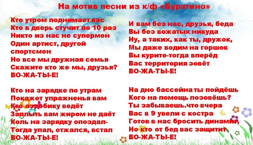 С более старшими ребятами вожатым и воспитателям приходится не так просто. Песни помогут организовать и сплотить отряд подростков, главное, подобрать те, которые будут им интересны. Рекомендуем не оставлять без внимания и те песни, которые пели когда-то их родители, бабушки и дедушки. Например, песня из к/ф «Веселые ребята», с красивым мотивом и со словами, которые способны воодушевить и взрослых и детей. Ну а песни известного артиста и поэта, Владимира Высоцкого, это классика на все времена. В нашей подборке мы предлагаем спеть с отрядом песню на мотив мелодии «Вершина»