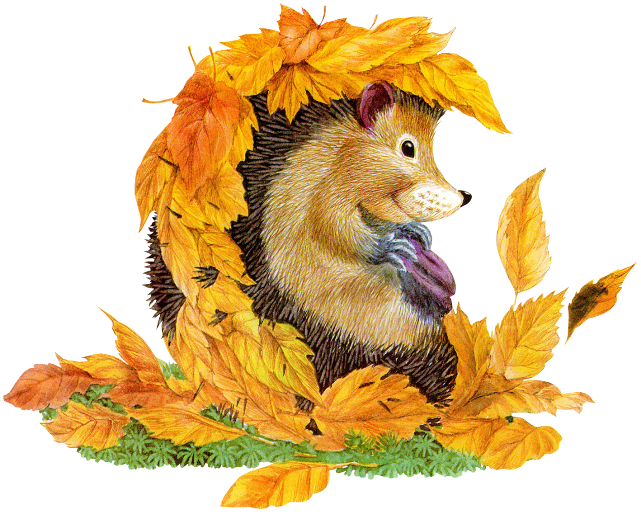 Наряду с осенними поделками в каждой группе с наступлением осени необходимо оформить осеннюю стенгазету. Ветки рябины, багряные листья, шишки, орехи и другие плоды закончившегося лета — это далеко не все, что можно изобразить на коллаже. Начать оформление газеты можно прямо с рамки, нарисуйте по контуру листья клена, липы, и обрежьте края газеты по их линии. Контур будет также считаться завершенным, если из листа ватмана вырезать фигуру какого-либо животного, например как этот ежик, на фото ниже.