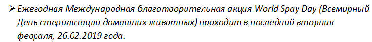 Во всемирной акции берет участие большинство ветеринарных клиник и приютов России. В этот день повсеместно пропагандируется стерилизация домашних питомцев, дворняжек. Ценовая политика в разы ниже, в некоторых клиниках услуги предоставляются бесплатно. К сожалению, попасть в этот день на плановое оперативное вмешательство можно только предварительно записавшись в ближайшую к вам клинику.