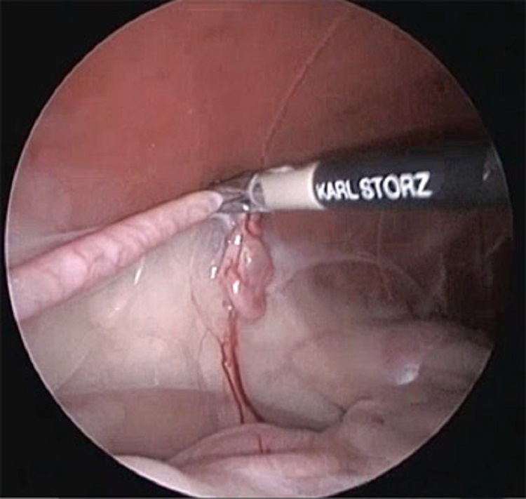 Оперативное вмешательство при очень маленьком надрезе. При этом специалисты используют специальный крючок. Длина надреза не более 1 см. В основном происходит частичное удаление, матка остается на месте, так как ее не всегда удается извлечь при помощи крючка.