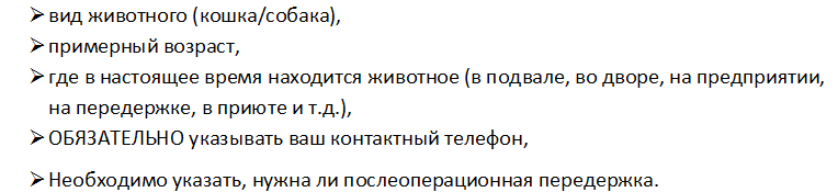 После предварительной записи сменить клинику уже нельзя. С собой нужно иметь средства защиты швов, например попоны, воротнички.