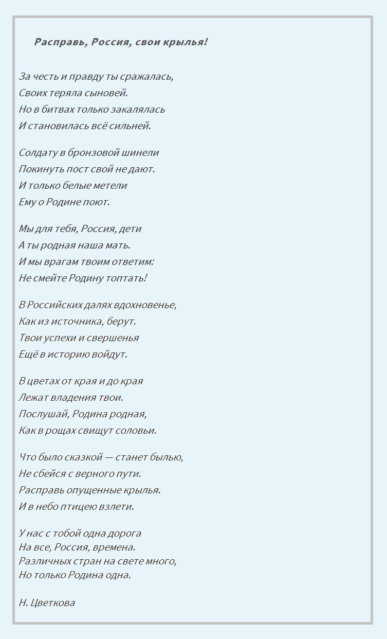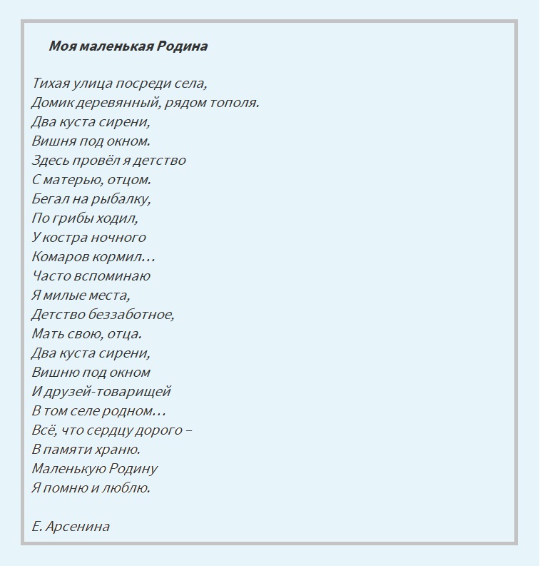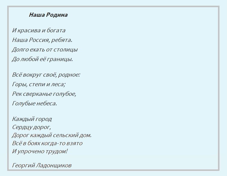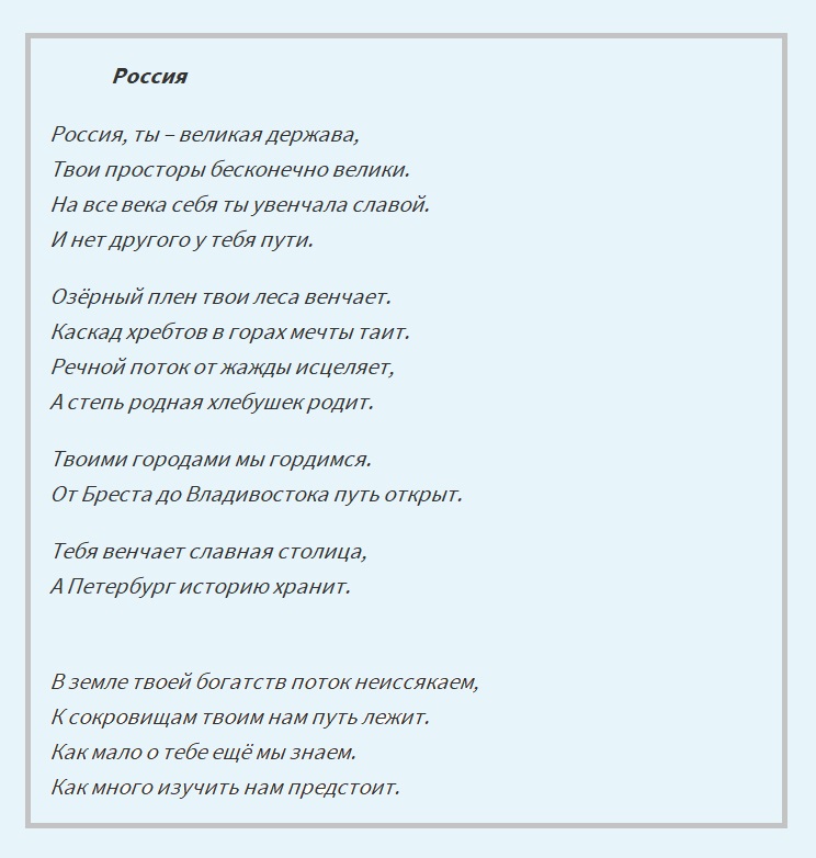 Россия милая Россия, страна великая моя, как ты прекрасна и добра. Переходя в старшие классы, меняются не только предметы, их количество. Дети начинают изучать литературу, читают большее количество произведений русских писателей, в том числе и стихов. Стихотворения учатся на память намного чаще чем в начальной школе. Стихи становятся больше, в них глубже смысл. Но они, как и прежде, запоминаются легко. Ведь они о нашей Родине, России.