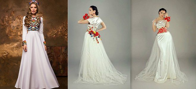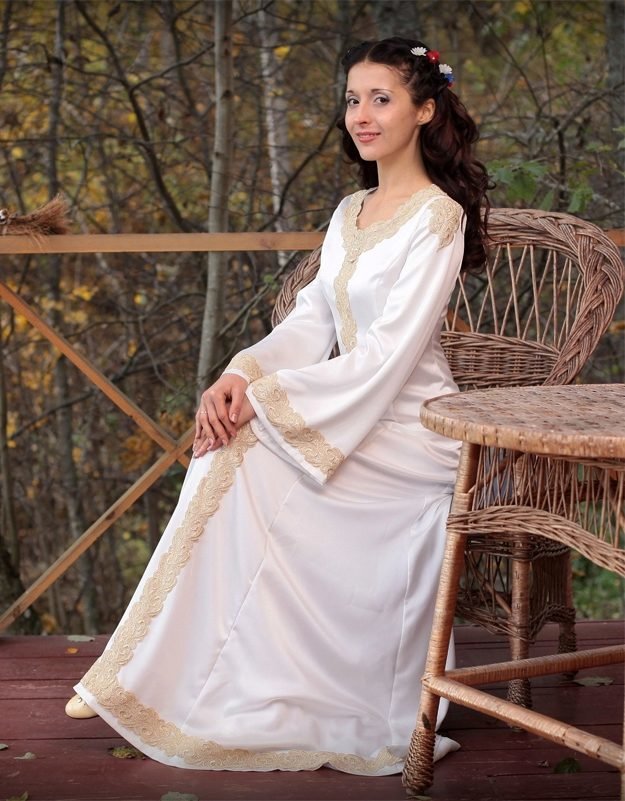 Платье молодой состоит из рубахи и клинообразного сарафана с широкими лямками. Традиционный наряд новобрачной не может быть чисто белого цвета. Придерживаться можно сочетания красного с белым или белого с синим. На сарафане может быть орнамент в виде геометрических узоров или природных элементов (цветов, листков). Крой сарафана, который расширяется к низу, скрывает все недостатки фигуры.