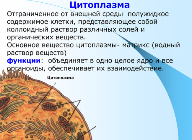 Цитоплазма — наполняет все пространство клетки, представляет из себя бесцветную вязкую жидкость.
