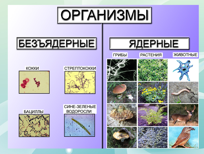 Все субъекты живой природы делятся в зависимости от строения клеток на эукариот и напрокариот (более простое строение).  И те и другие клетки окружает плазматическая мембрана, которая снаружи, во многих случаях, окружена клеточной стенкой. Внутренность клетки наполнена цитоплазмой.