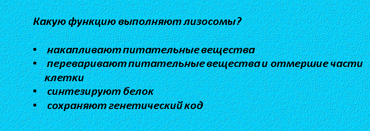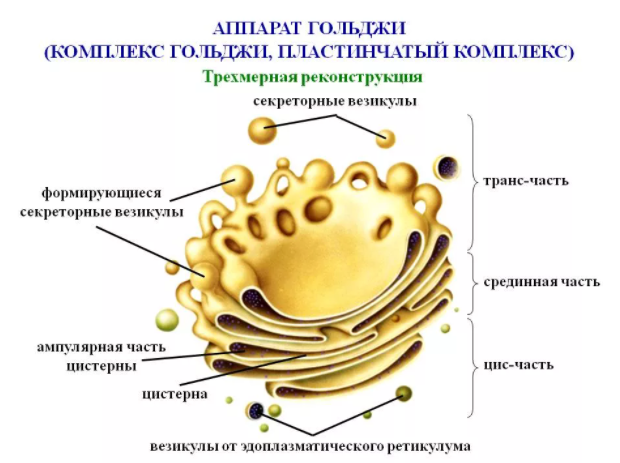 Лизосомы — округлые органеллы, одномембранные, микроскопические. Их количество зависит от физиологического состояния клетки и от ее жизнедеятельности. Переваривают пищу, которая попадает в клетку и играет защитную роль. Аппарат Гольджи — эта часть клетки наиболее подвижна из всей системы мембран. В его цистернах откладываются поступающие вещества, а так же, продукты распада и синтеза. Затем, они переходят в цитоплазму и используются либо выходят наружу. В клетках растений аппарат Гольджи участвует в формировании стенки клетки.