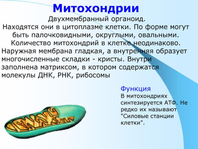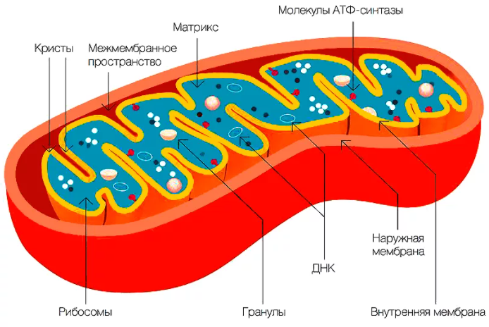Митохондрии состоят из двух мембран, внутренняя имеет наросты (кристы), внешняя — гладкая. В полужидком веществе (матриксе) располагаются РНК, ДНК, рибосомы, ферменты. Универсальная органелла является энергетическим и дыхательным центром. При помощи ферментов, в матриксе расщепляются органически вещества и освобождается энергия, которая синтезируется на кристах в АТФ.