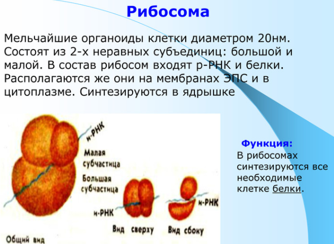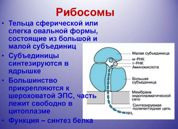 Рибосомы имеют округлую форму, состоят из рРНК и белка. Эти органеллы универсальны и присутствуют как в животных клетках, так и в растительных. Находятся они на мембранах ЭПС или в цитоплазме в свободном состоянии. В них происходит синтез белков.