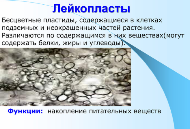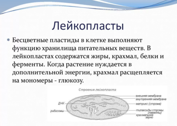 Лейкопласты — органеллы микроскопических размеров, имеют две мембраны в своем строении. Внутренняя образует выросты (2 или 3), форма лейкопластов округлая, они бесцветны, В них откладываются питательные вещества, в основном, крахмальные зерна. Строение усложняется на свету и лейкопласты превращаются в другой вид пластид — хлоропласты. Лейкопласты присущи растительным клеткам.
