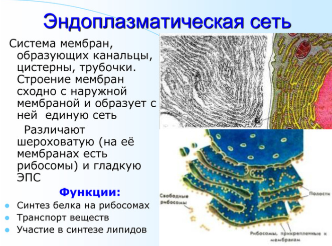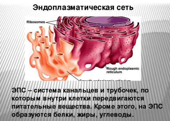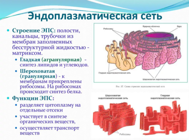 Эндоплазматическая сеть (ЭПС) — мембраны образуют микроскопические системы, состоящие из трубочек, канальцев, цистерн и пузырьков. ЭПС гранулярная имеет рибосомы, гладкая их лишена. ЭПС транспортирует вещества между клетками и внутри них. ЭПС гранулярная синтезирует белок, в ней происходит синтез жиров и образуются белковые молекулы.
