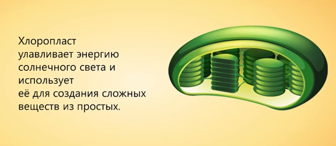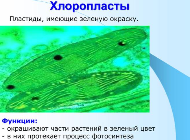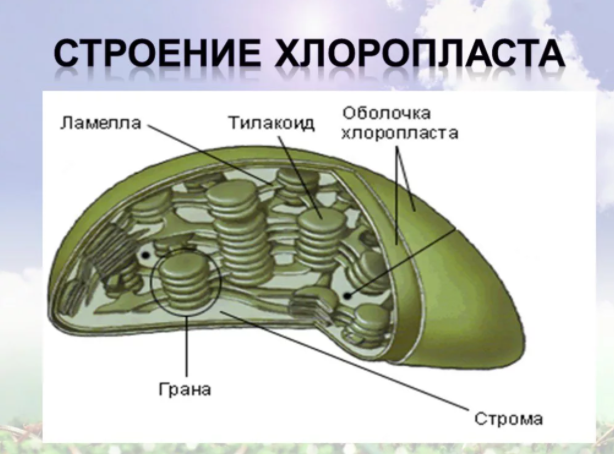 Хлоропласты — имеют строение двух мембранное, внутренняя мембрана состоит из 2-хслойных пластин (тиллакоидов), в них сосредотачивается хлорофилл, внешняя — гладкая. Зеленого окраса, присущи растительным клеткам. При наличии света и пигмента хлорофилла создают органические вещества (свободный кислород и углеводы) из неорганических (Н2О и СО2). Способны образовываться из лейкопластов, а по осени переходить в хромопласты (оранжевые и красные плоды, желтые и красные листья).