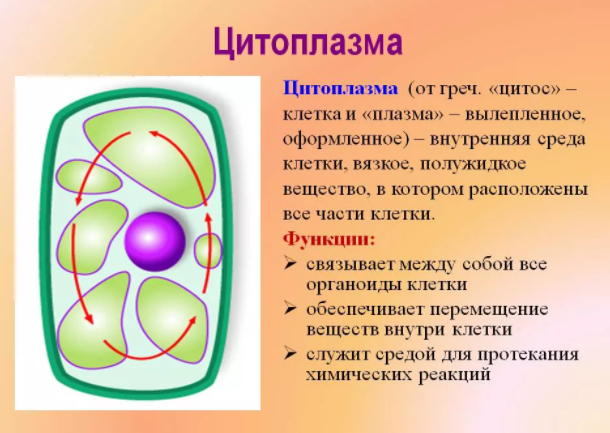 Внутренняя среда клетки, находящаяся в постоянном движении, называется цитоплазмой. Именно в ней расположены части, из которых состоит клетка.